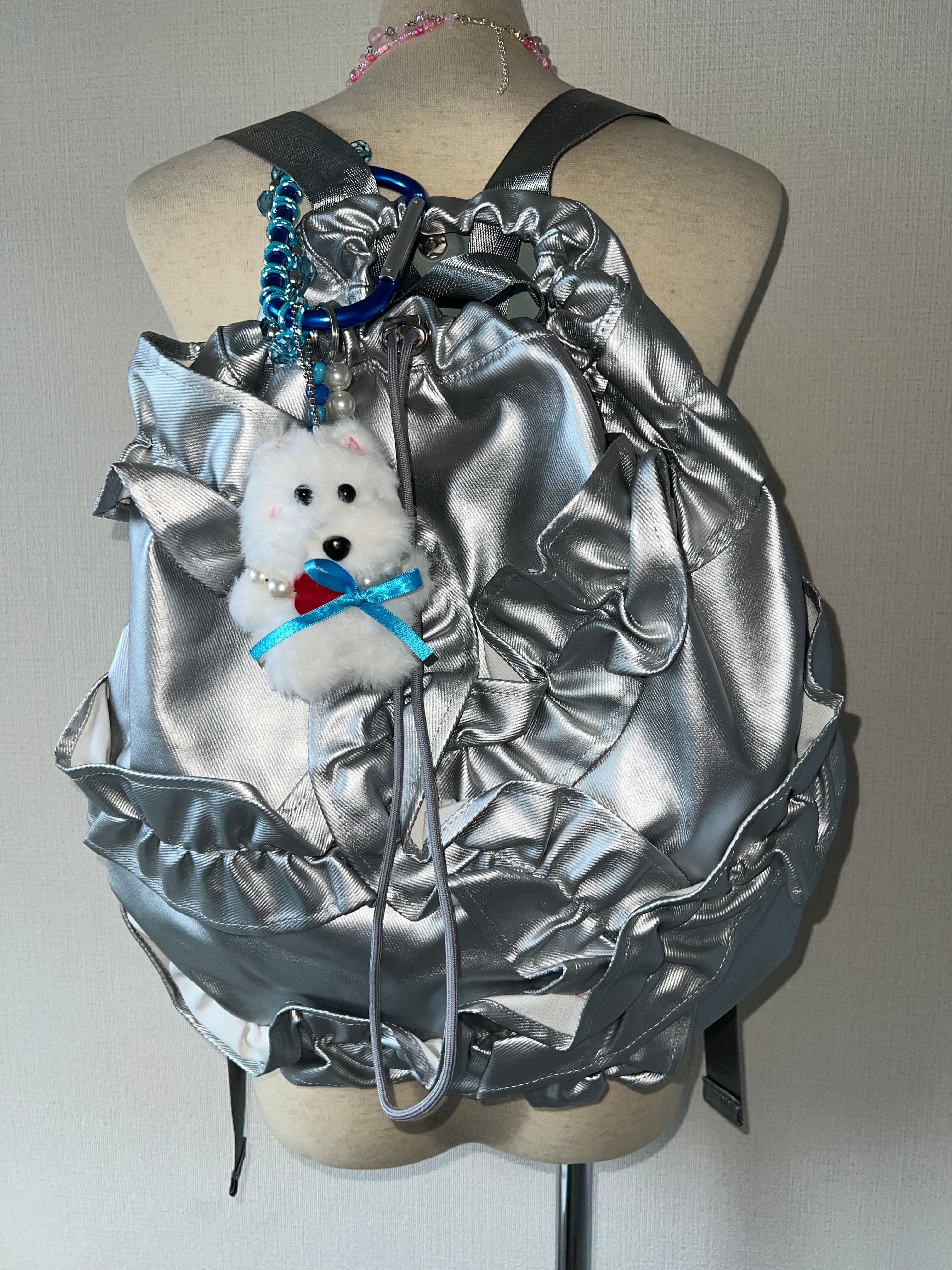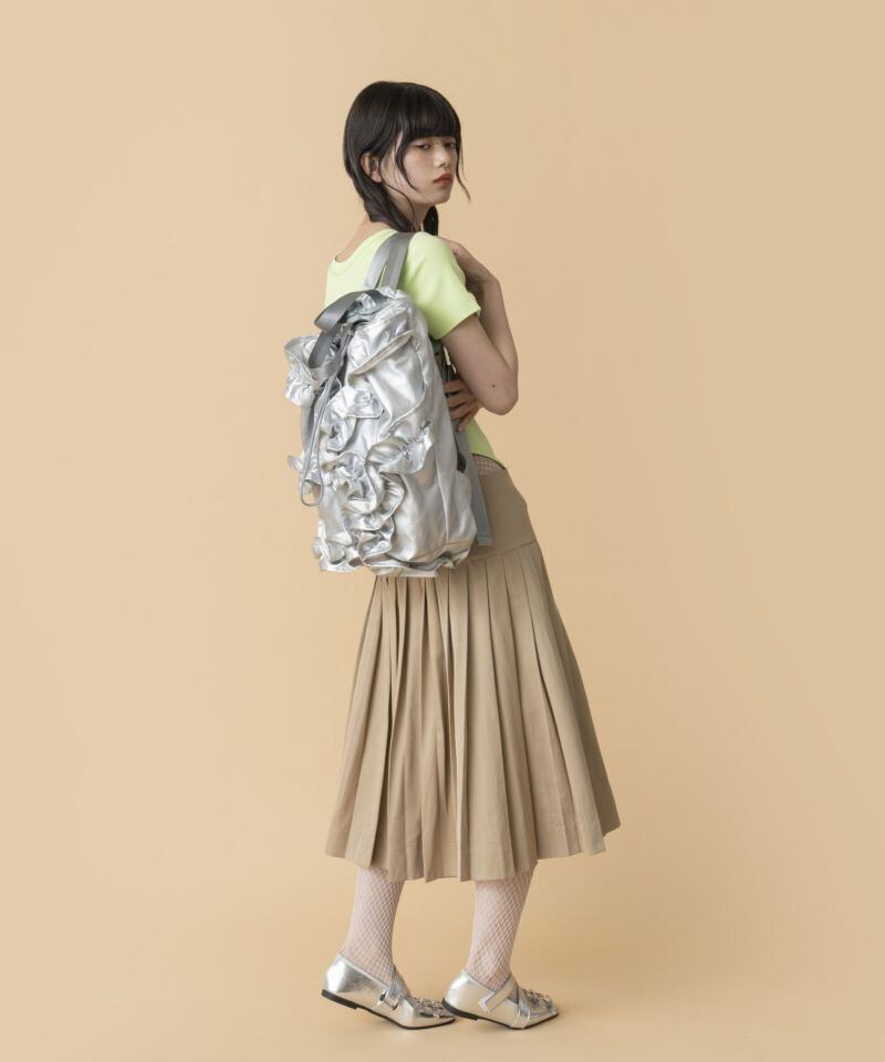 フリルたっぷりのコーディネートの主役になるナップサックです。