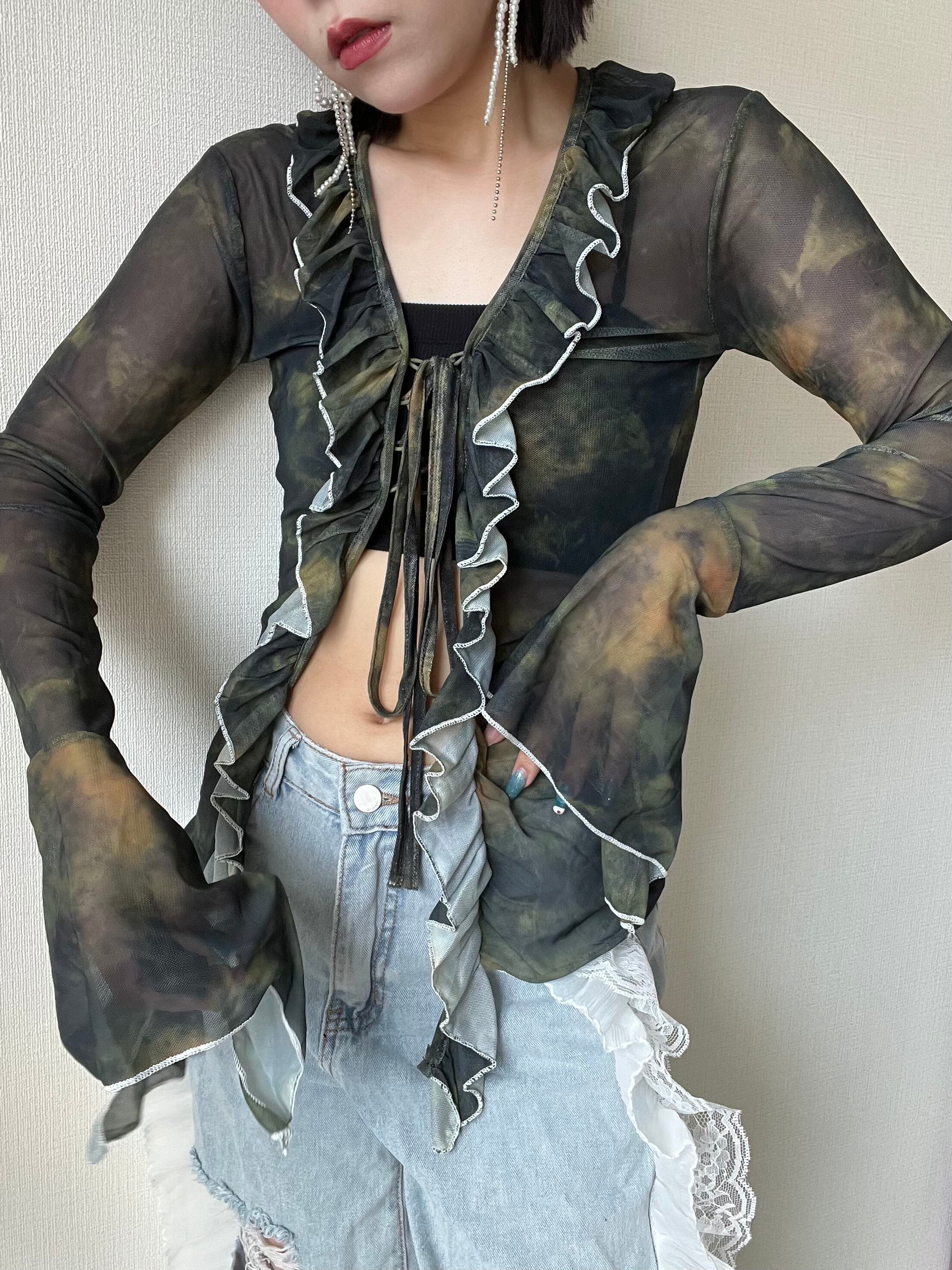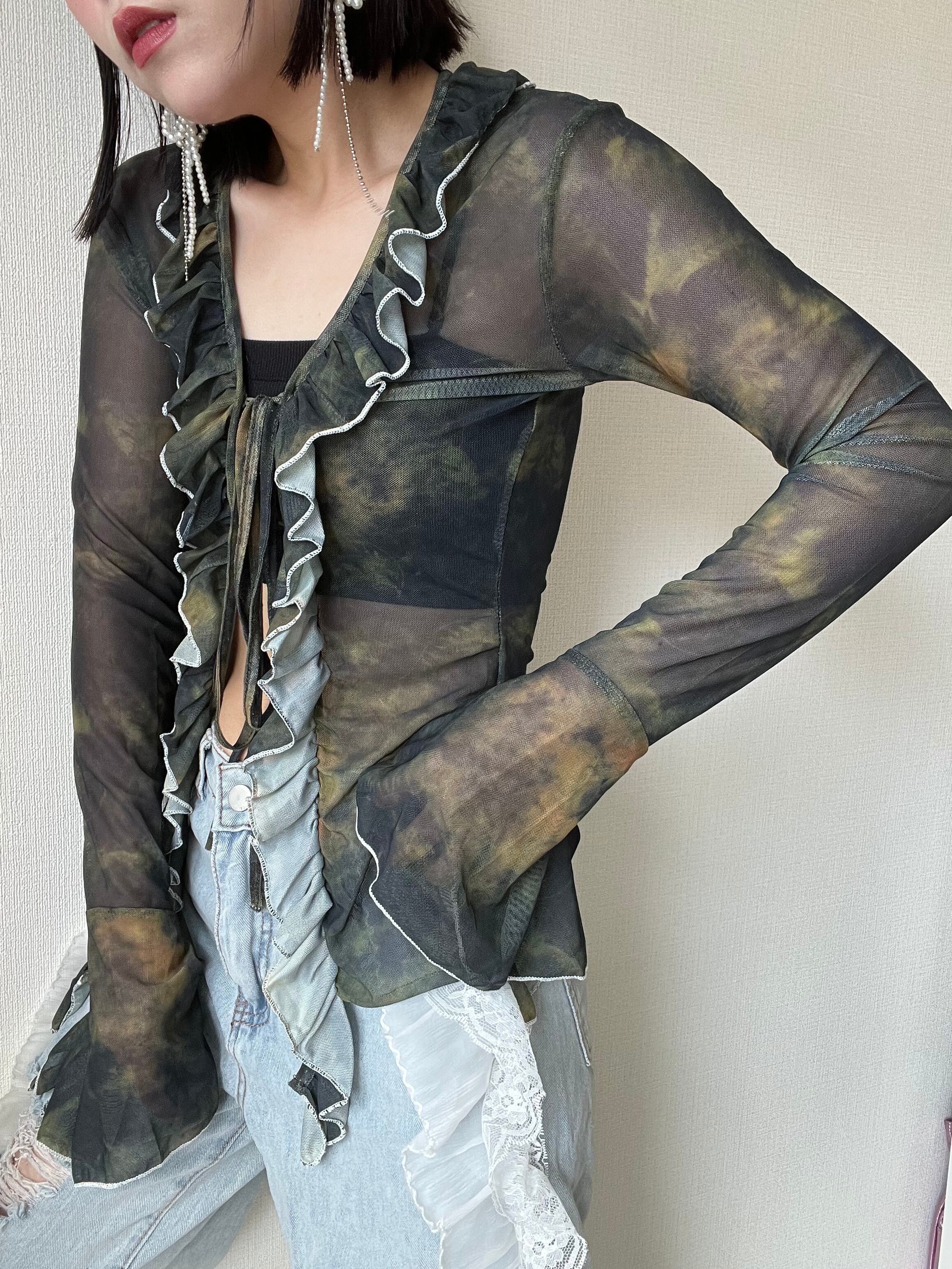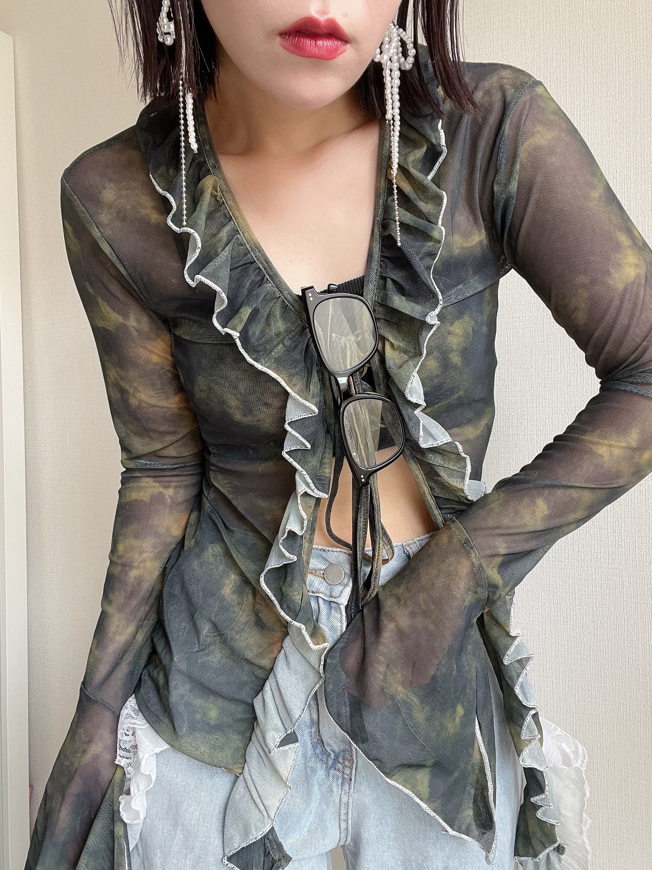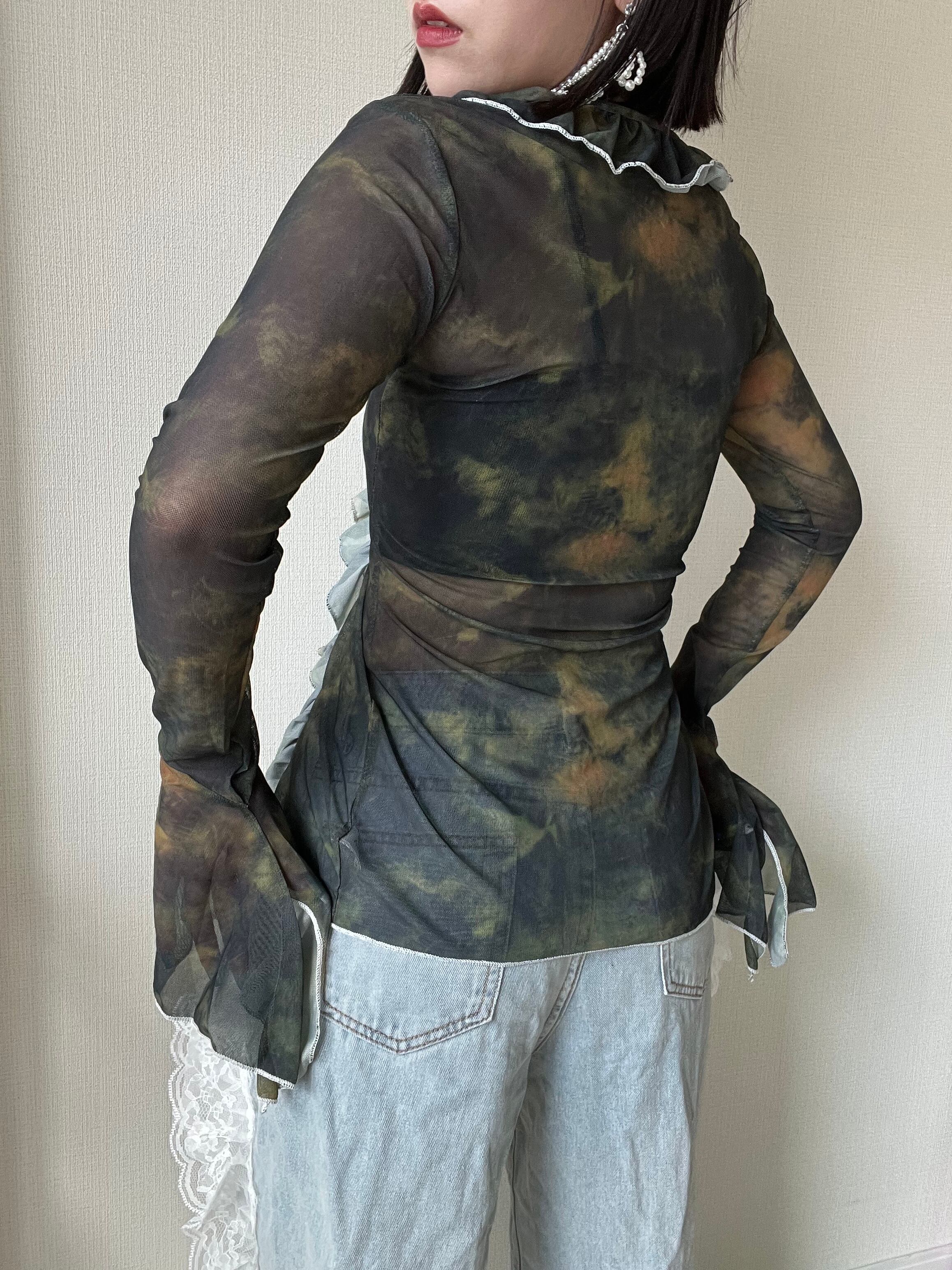 「深緑の蜃気楼」は、深みのある迷彩カラーと透け感のあるシアー素材が織りなす幻想的なブラウス。
