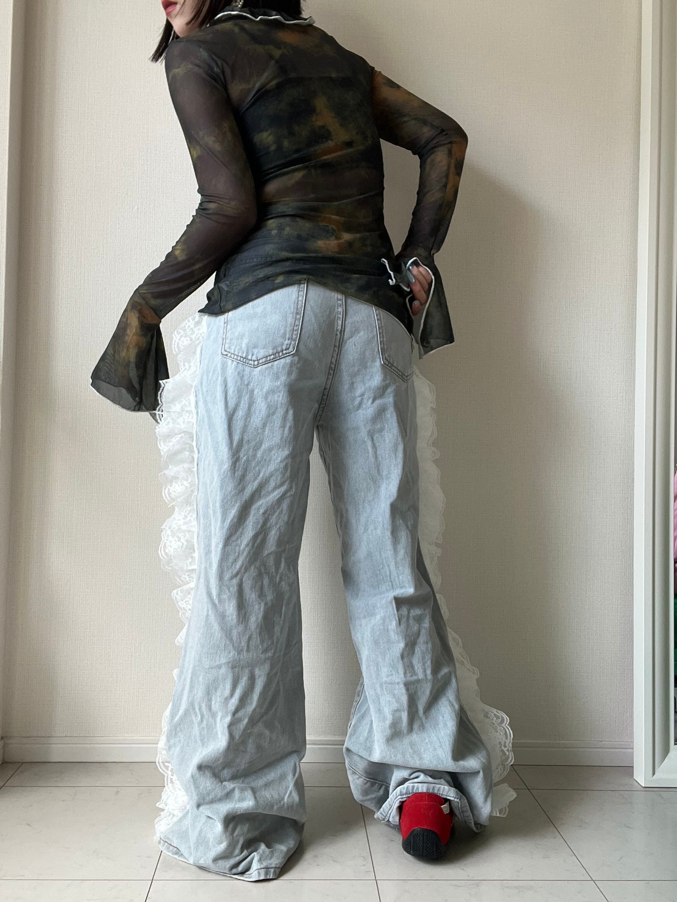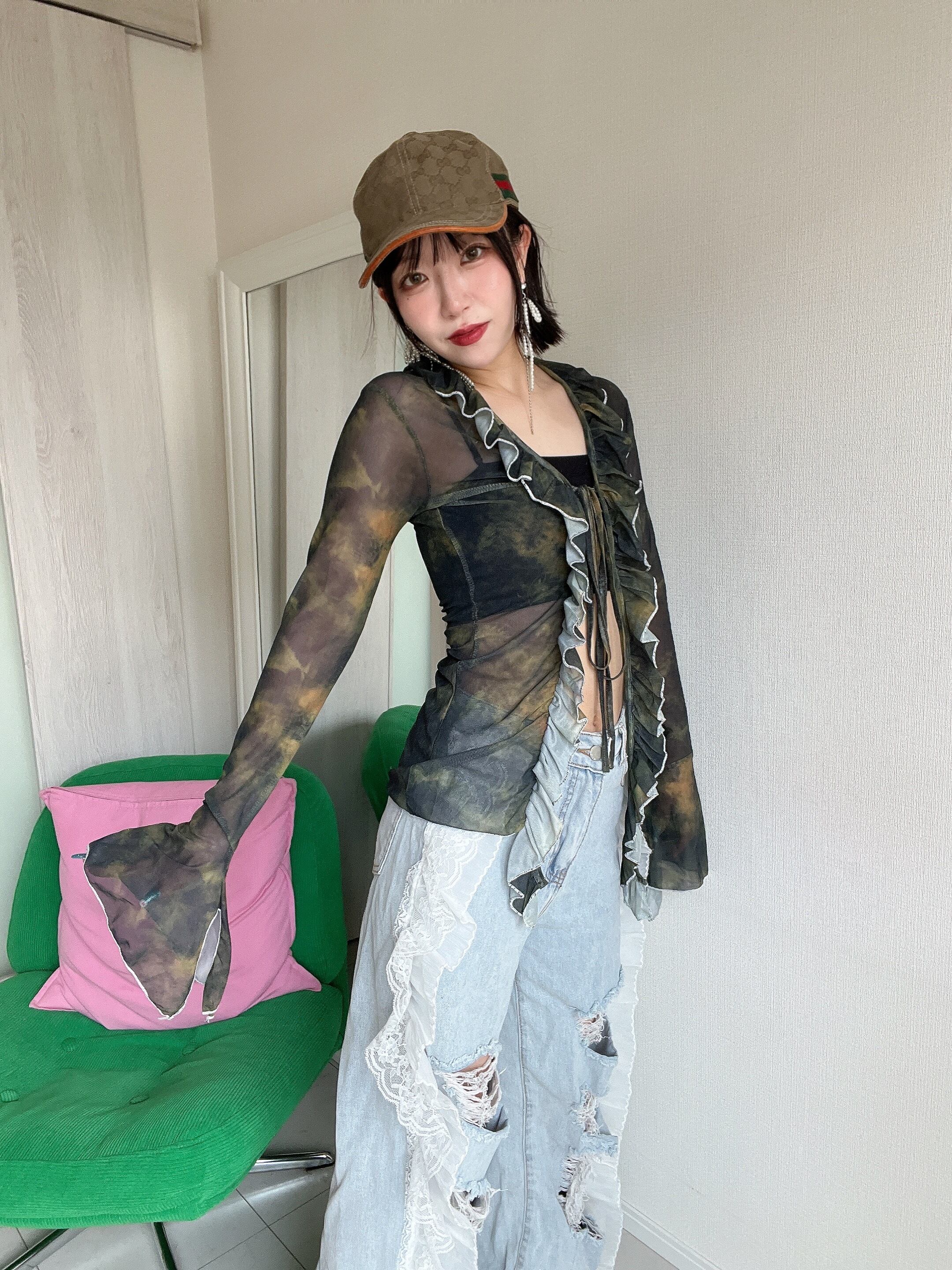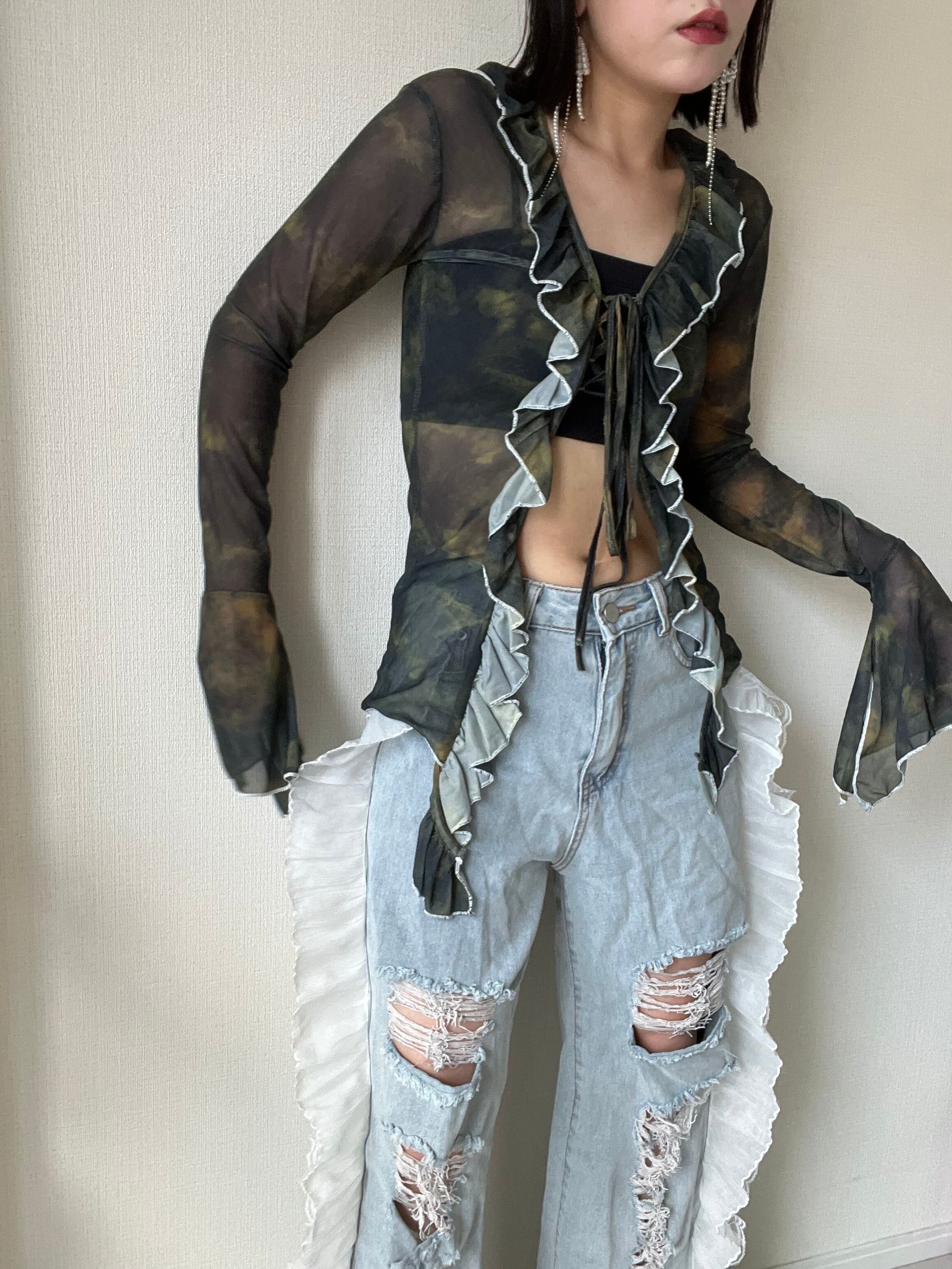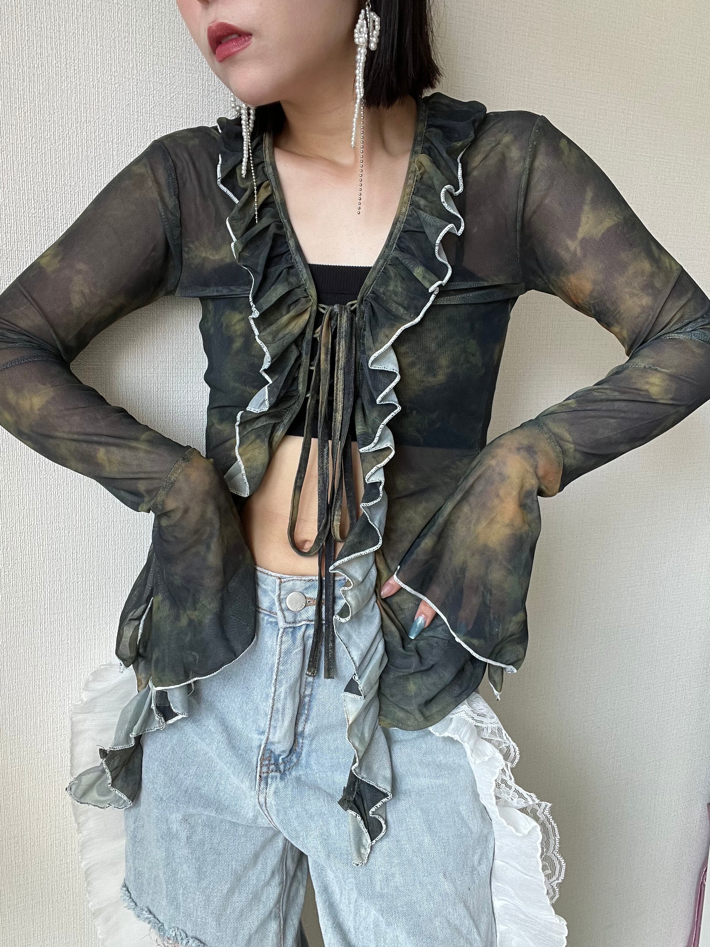 「深緑の蜃気楼」は、深みのある迷彩カラーと透け感のあるシアー素材が織りなす幻想的なブラウス。