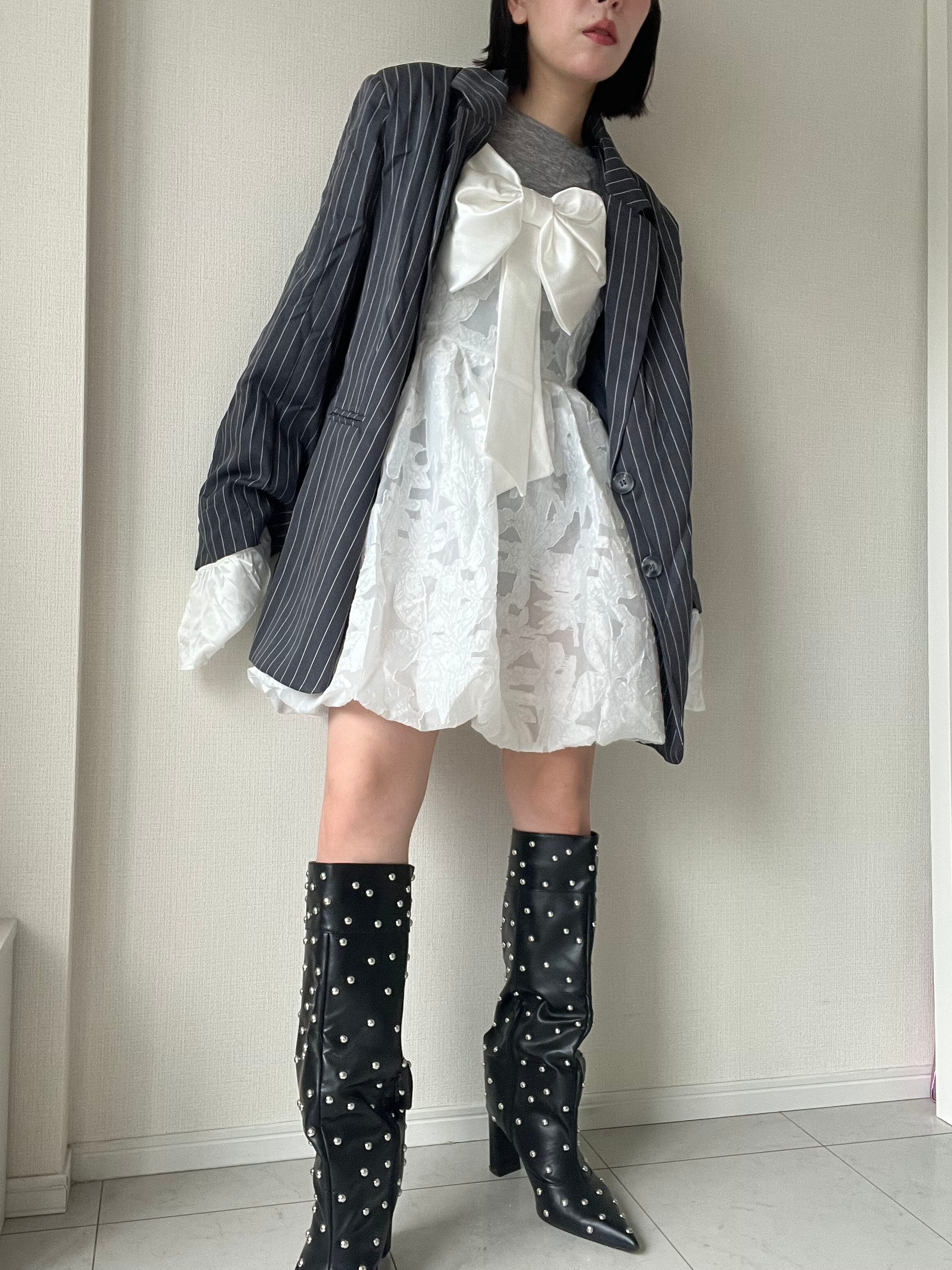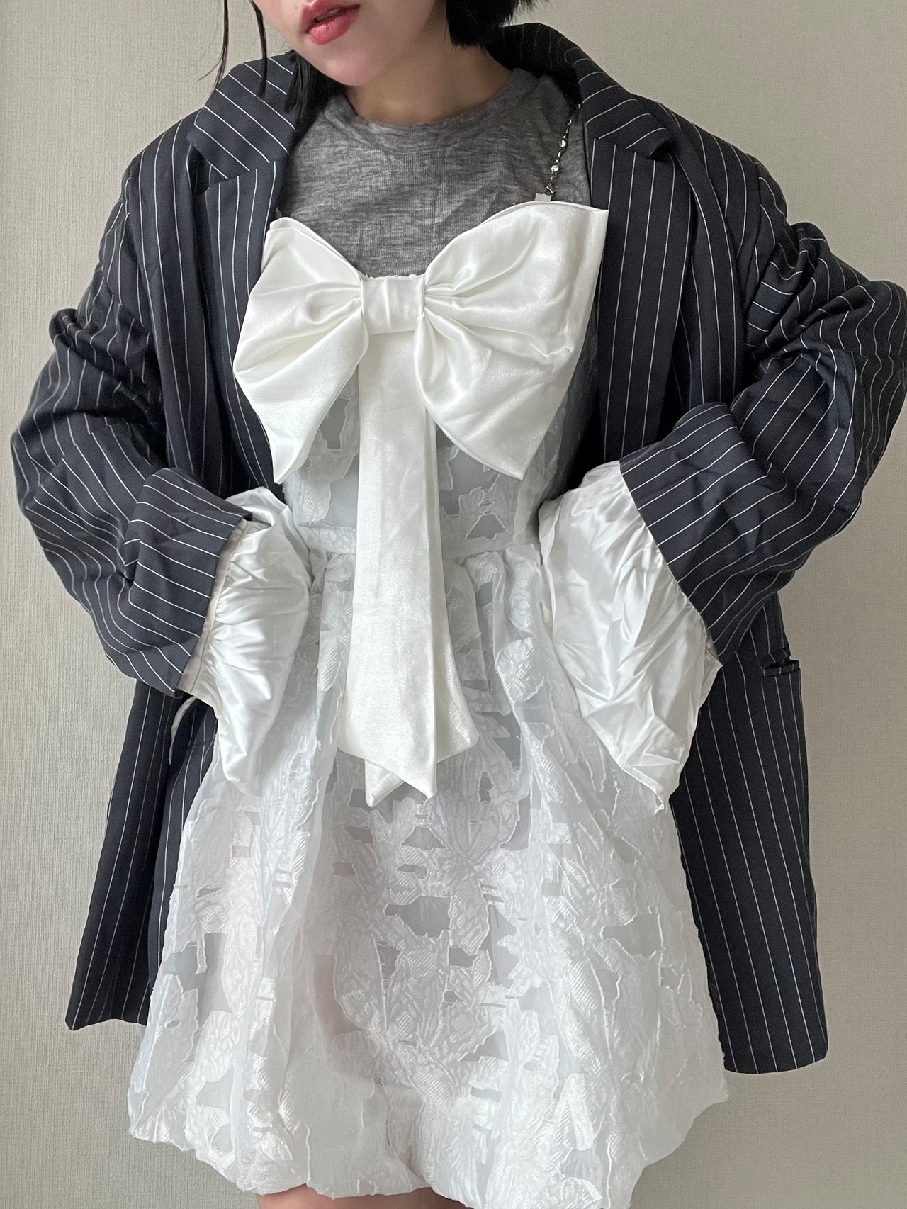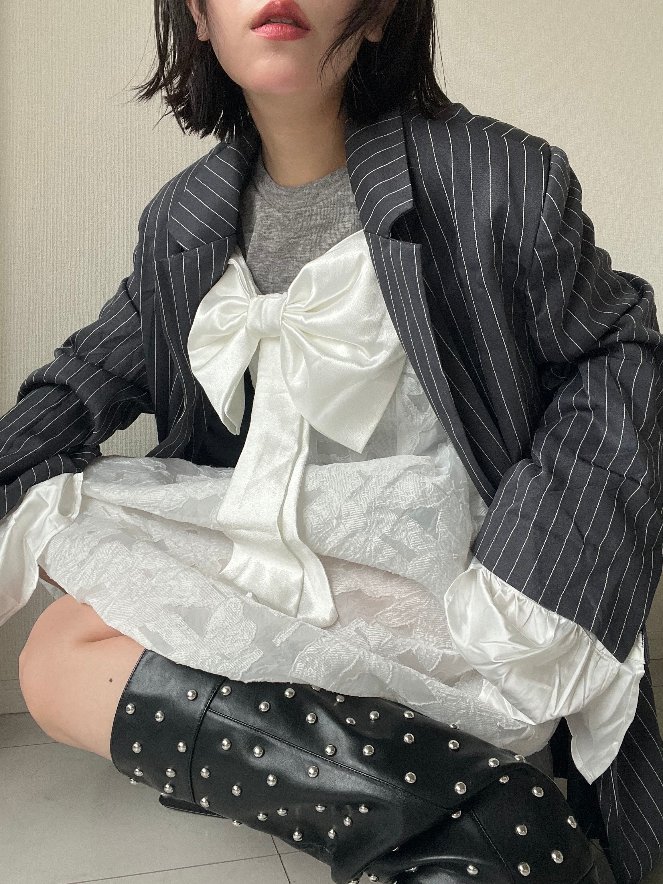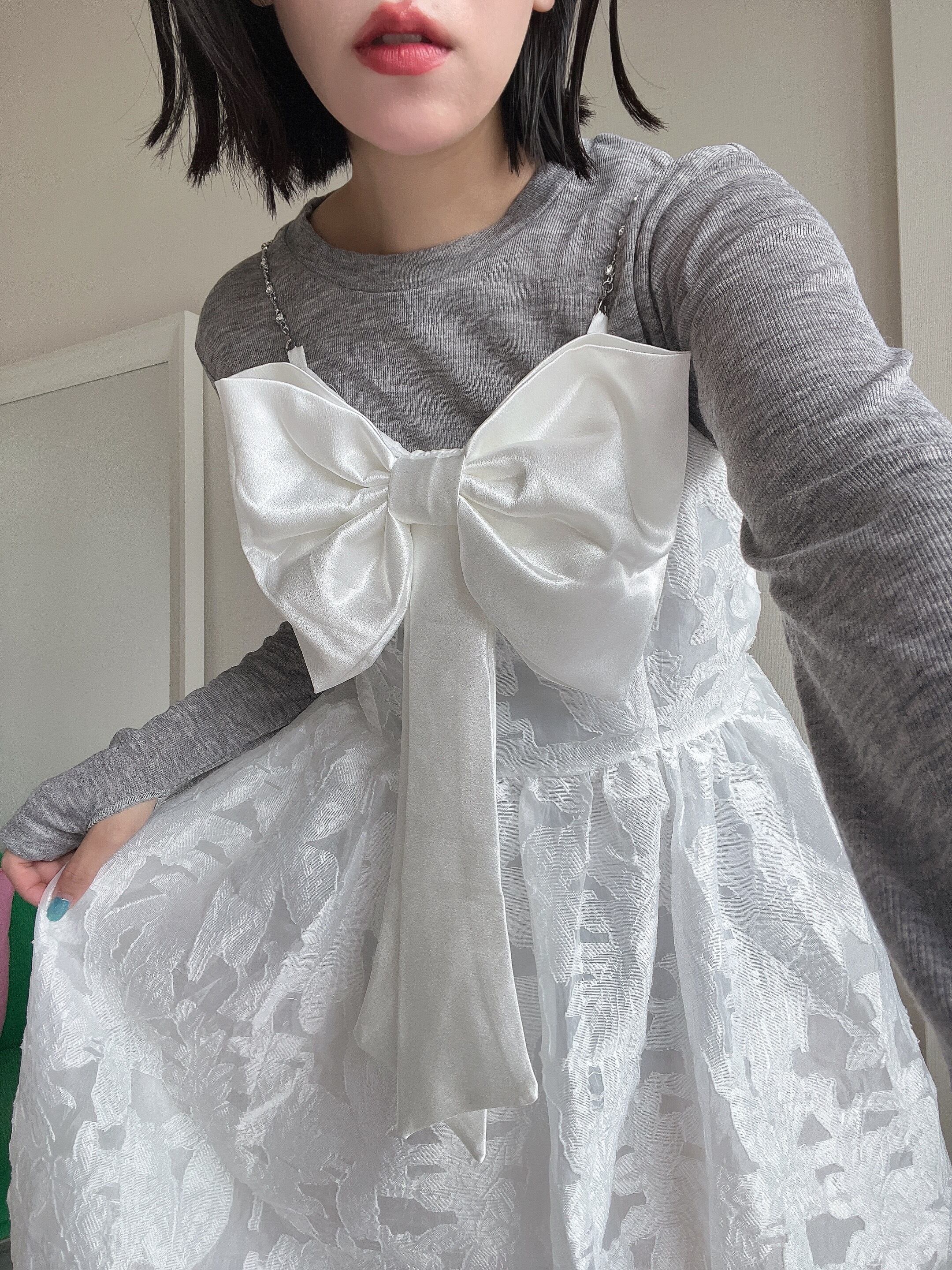 胸元には大きなリボンがアクセントとなり、甘さと華やかさをプラス。存在感がありながらも、全体は透明感あふれるシルエットで、まるで音符が舞うような軽やかさを纏えます。