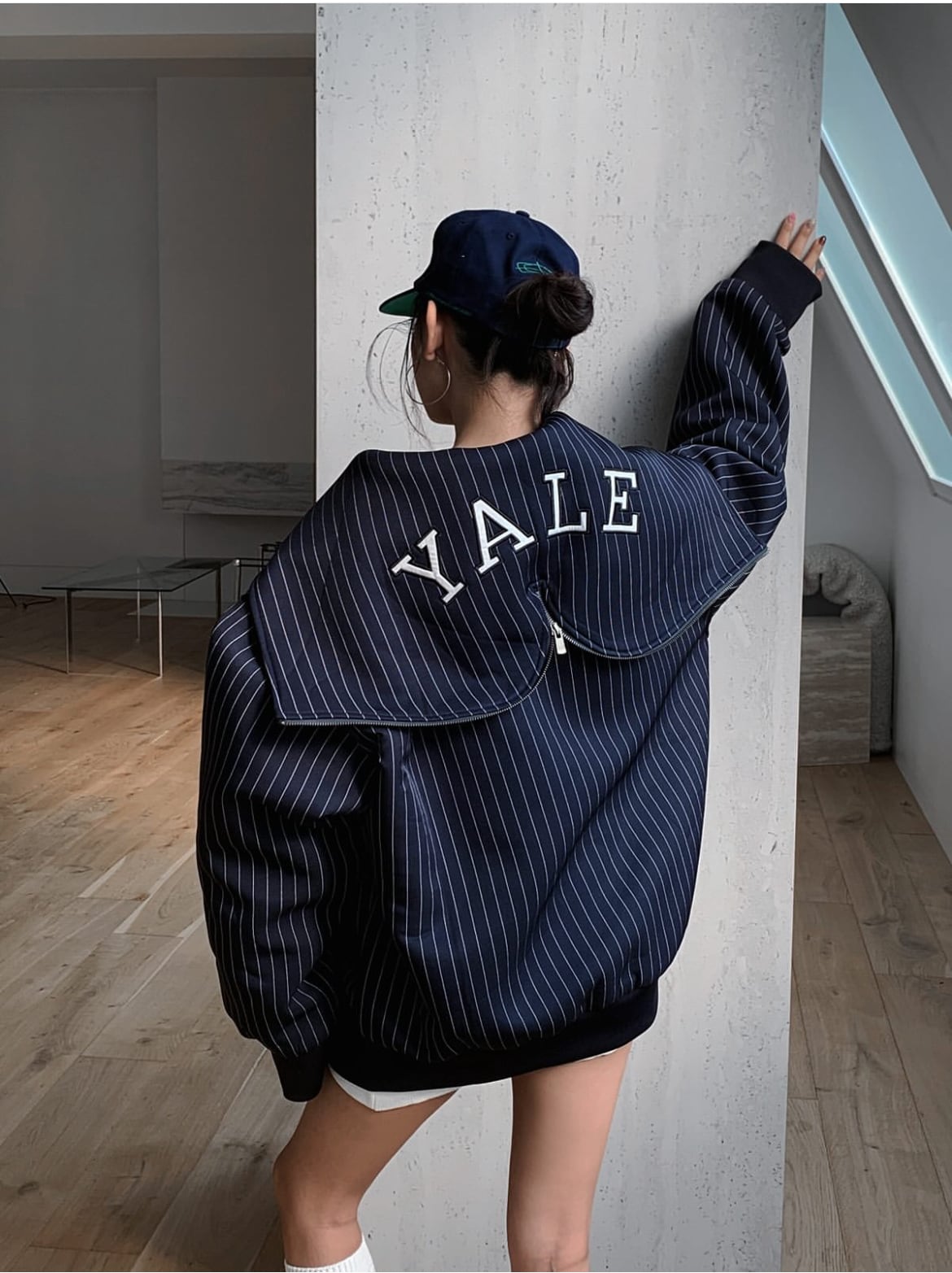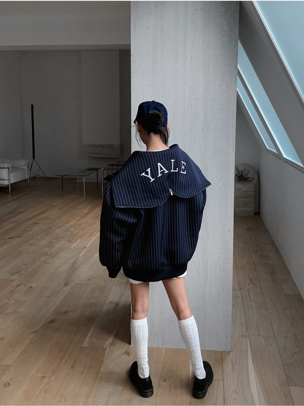 ピンストライプと、大きめのセーラー襟が印象的なモードジャケット。背中の大胆な刺繍とフロントのロゴが、クラシカルさの中にスポーティな遊び心を加えます。