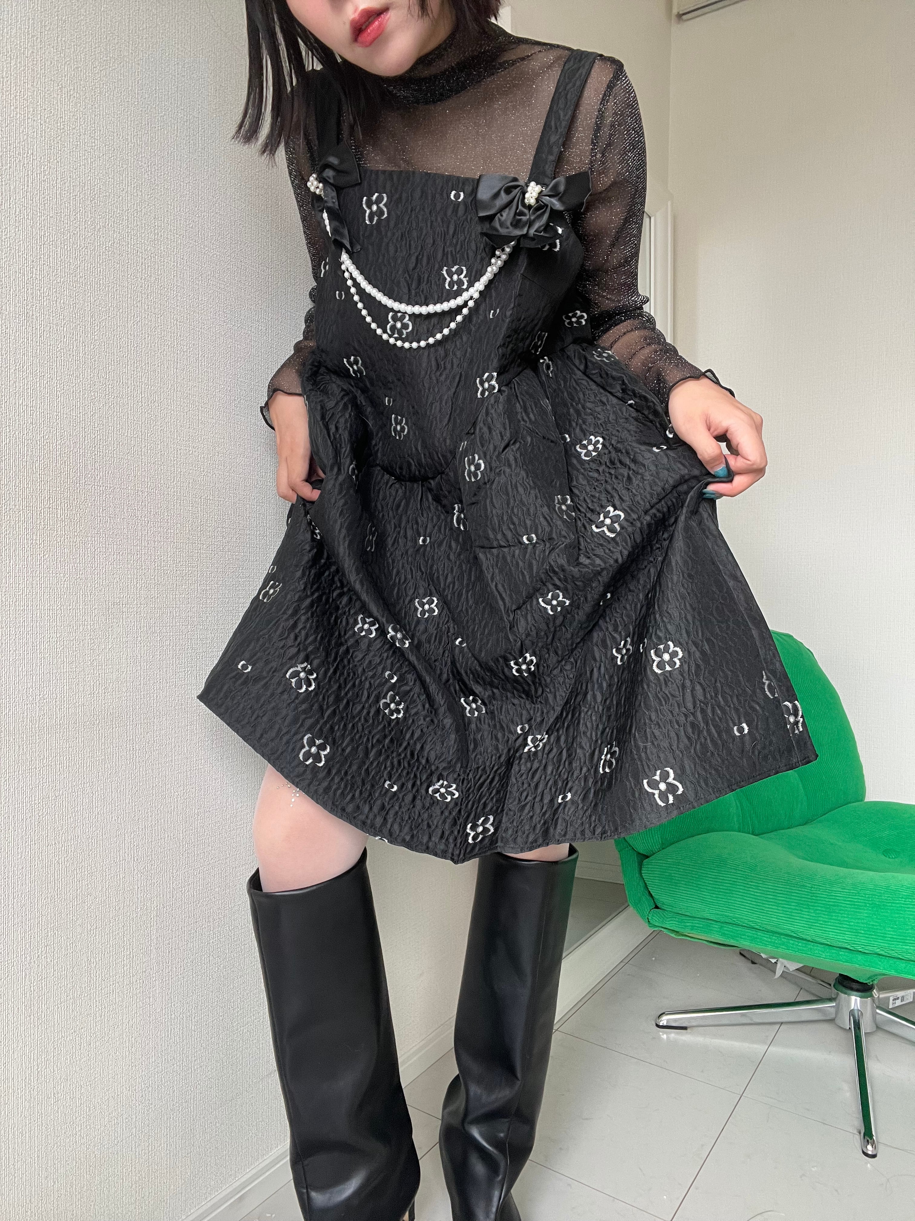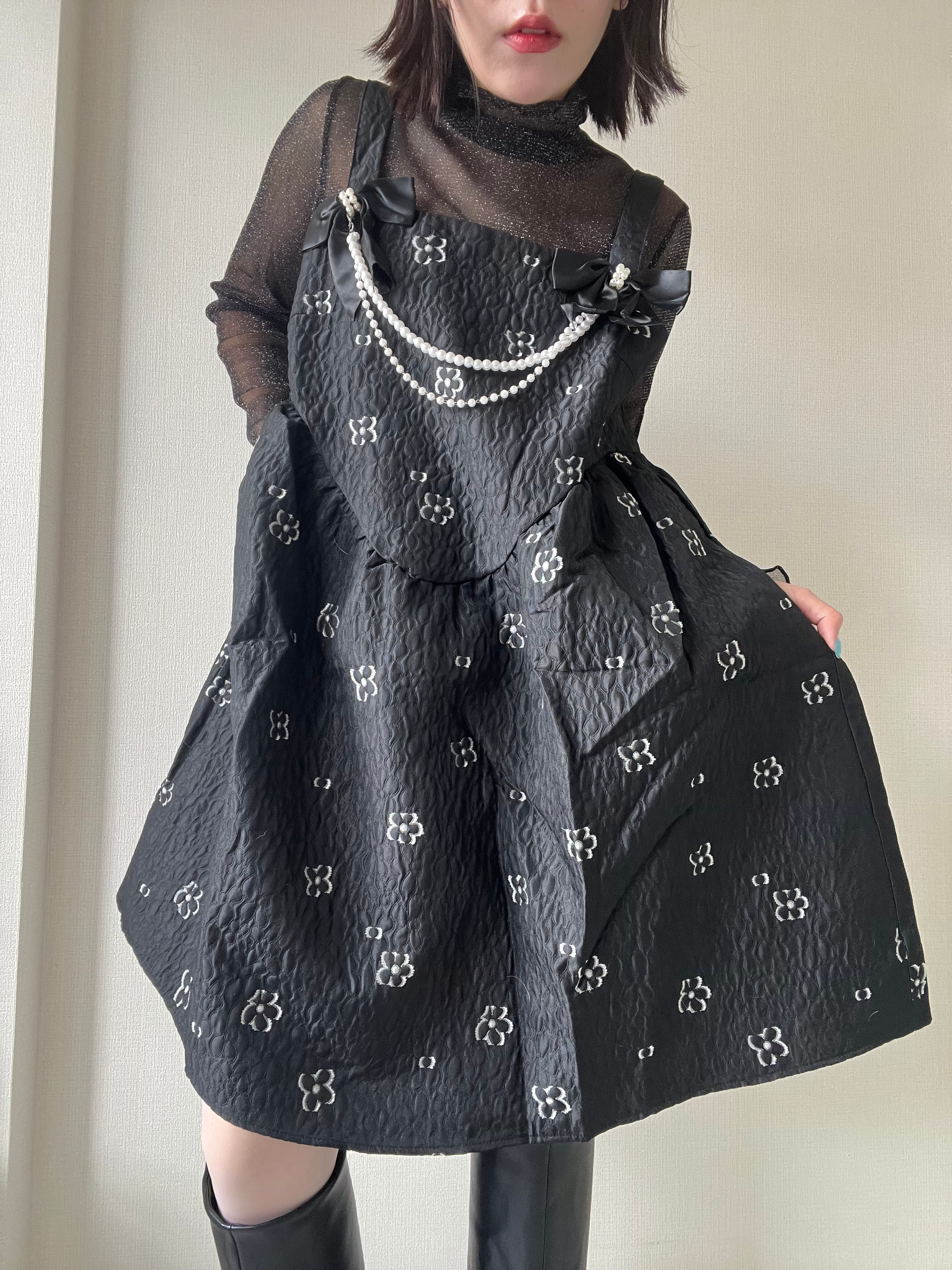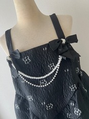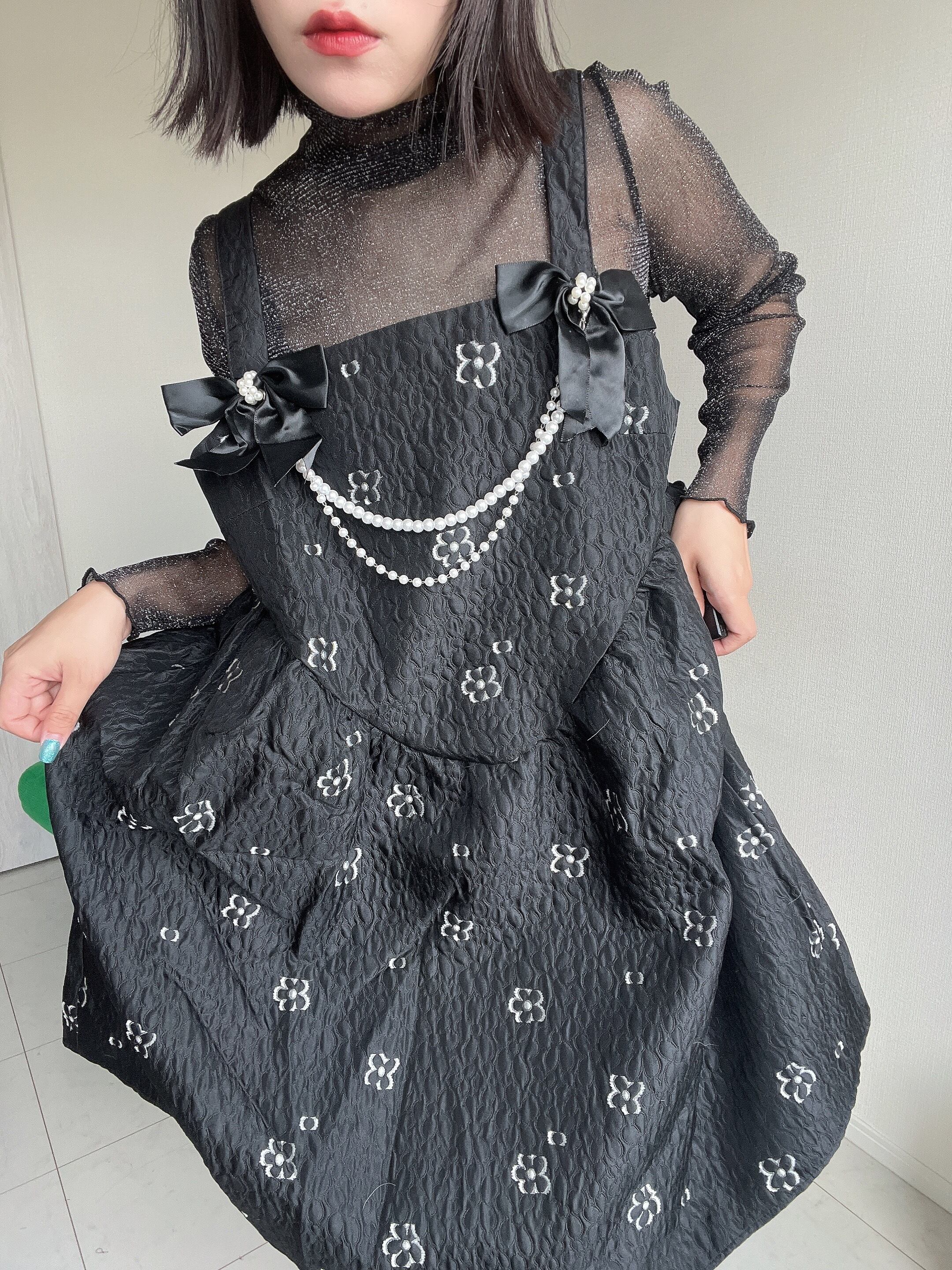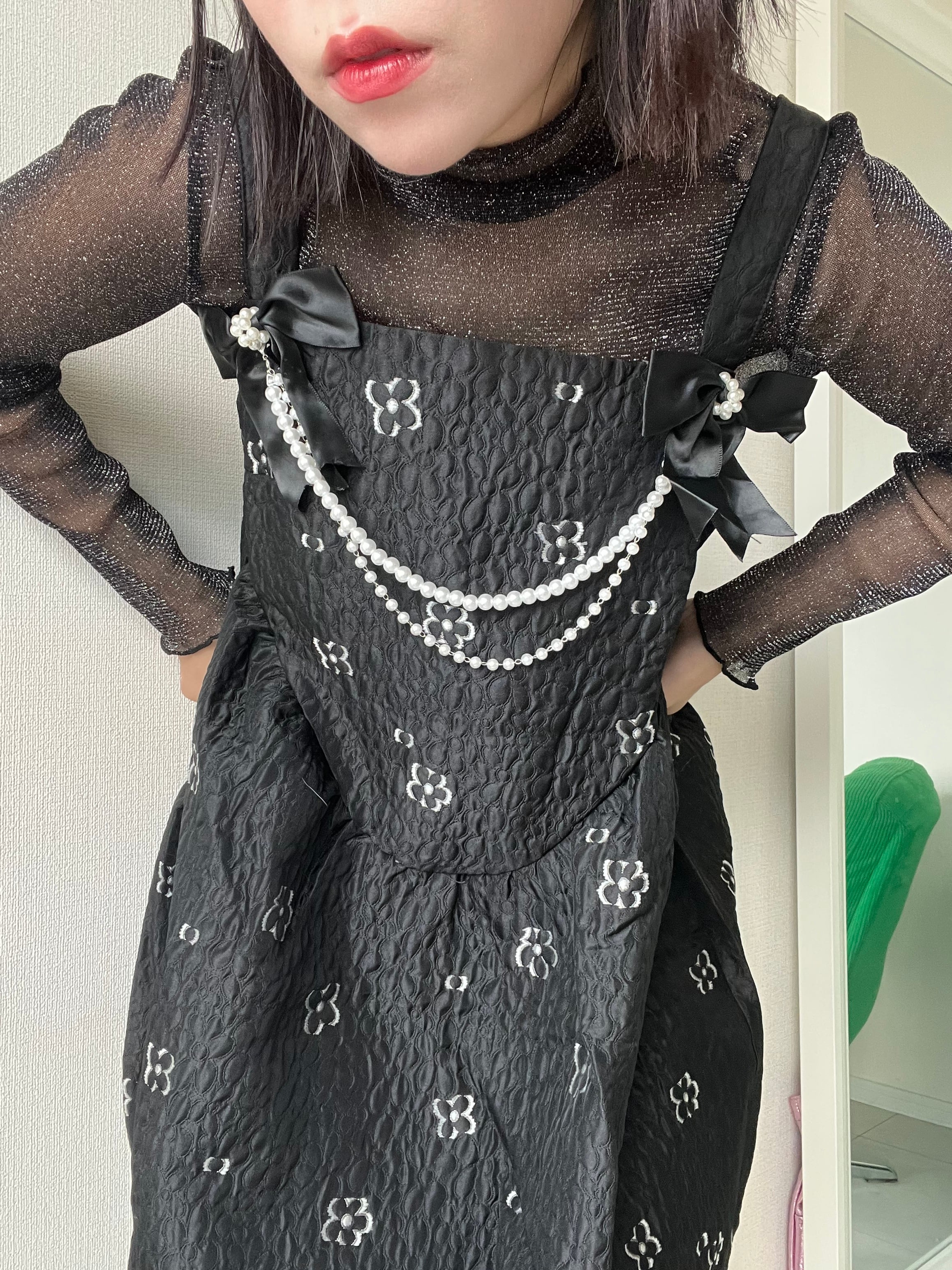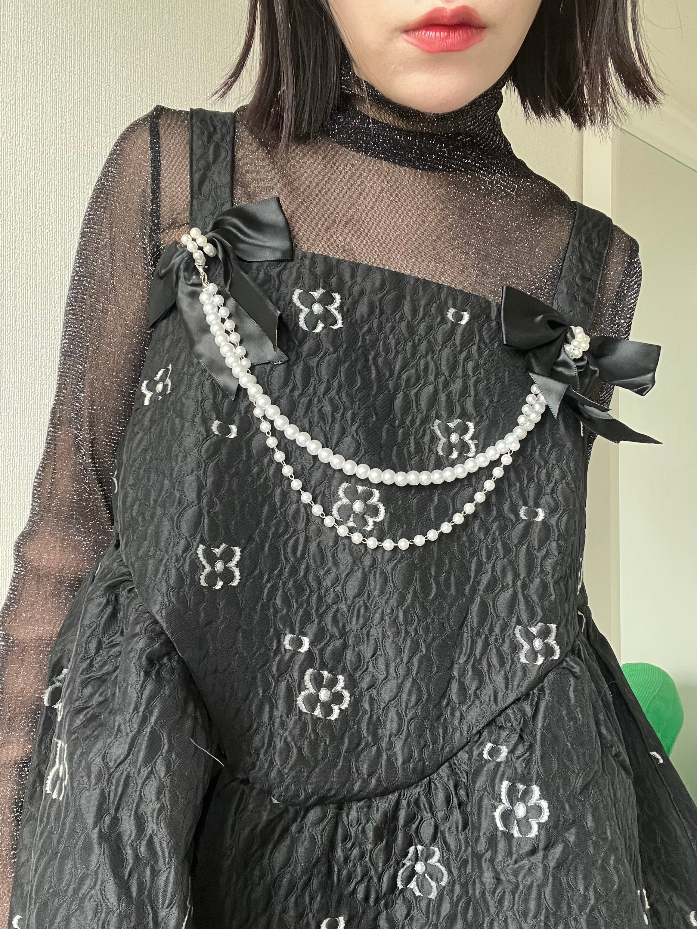 胸元には上品なパールチェーンとリボンをあしらい、クラシックな甘さをプラス。