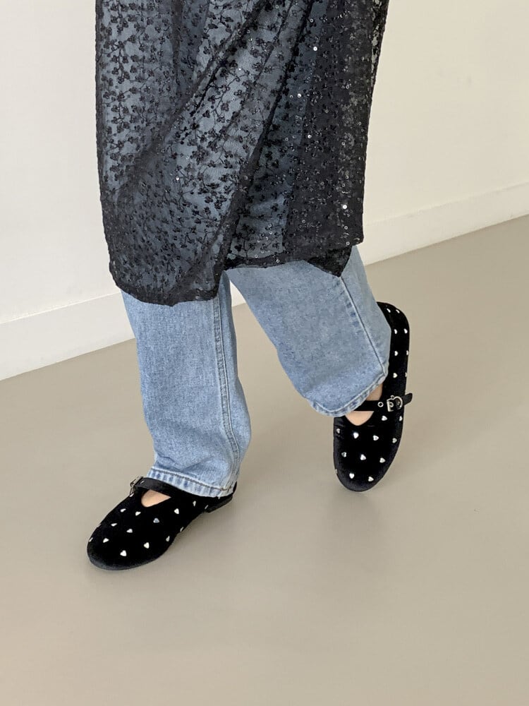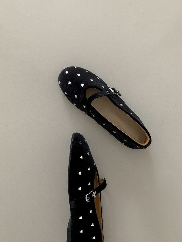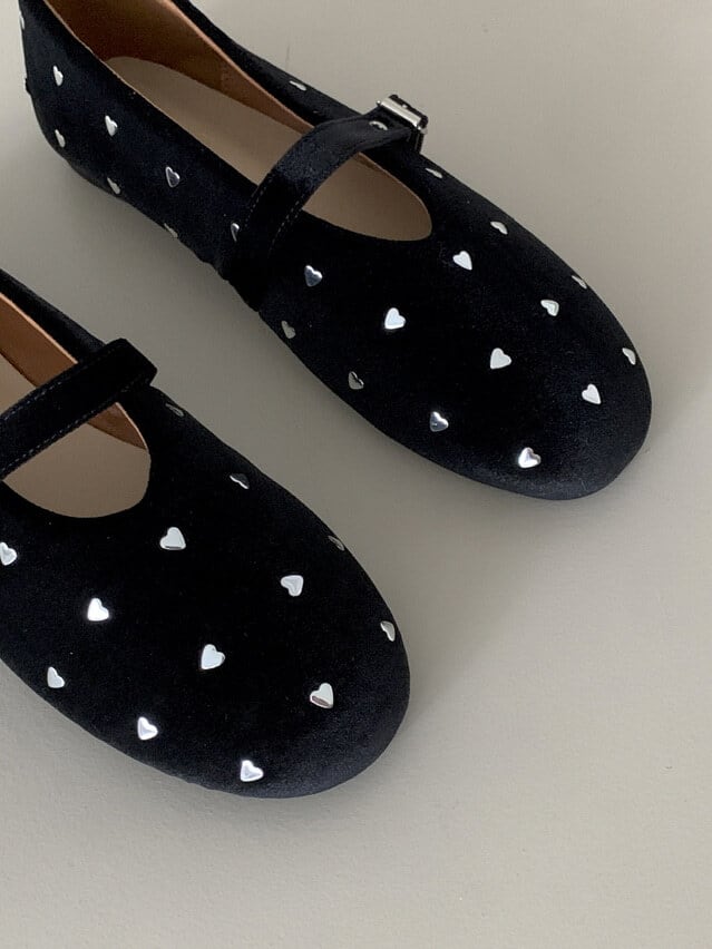 「銀河に舞う恋心」は、スエード素材にきらめくハートを散りばめた特別なメリージェーンシューズ。