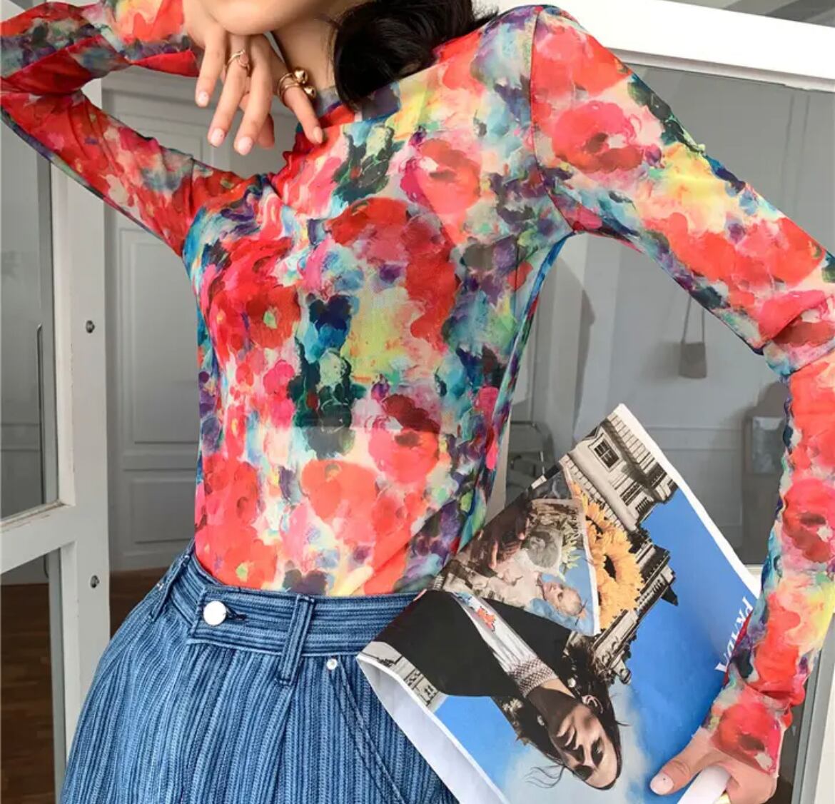 金魚のようなお花のような鮮やかな色合いのシアートップス。