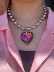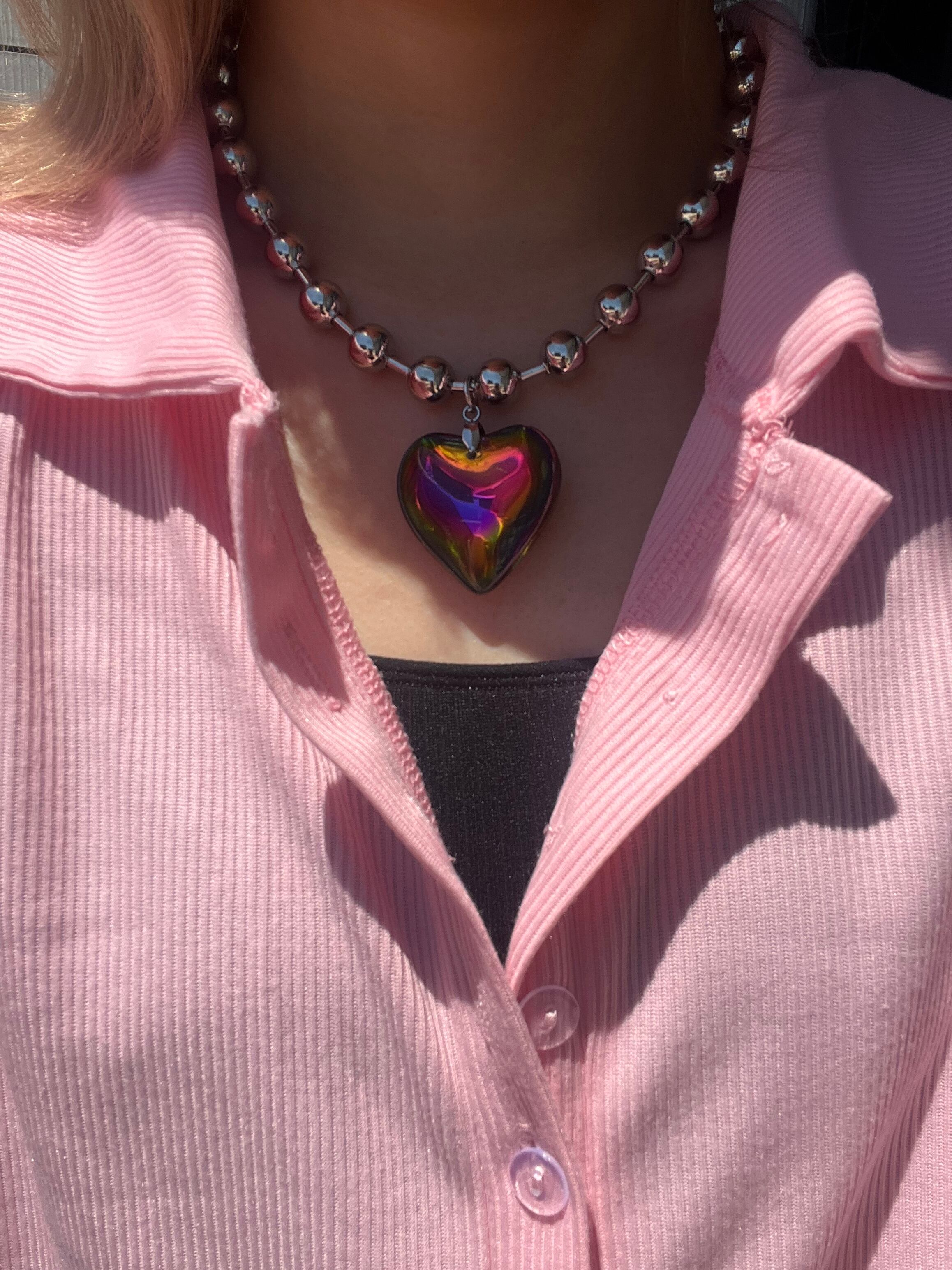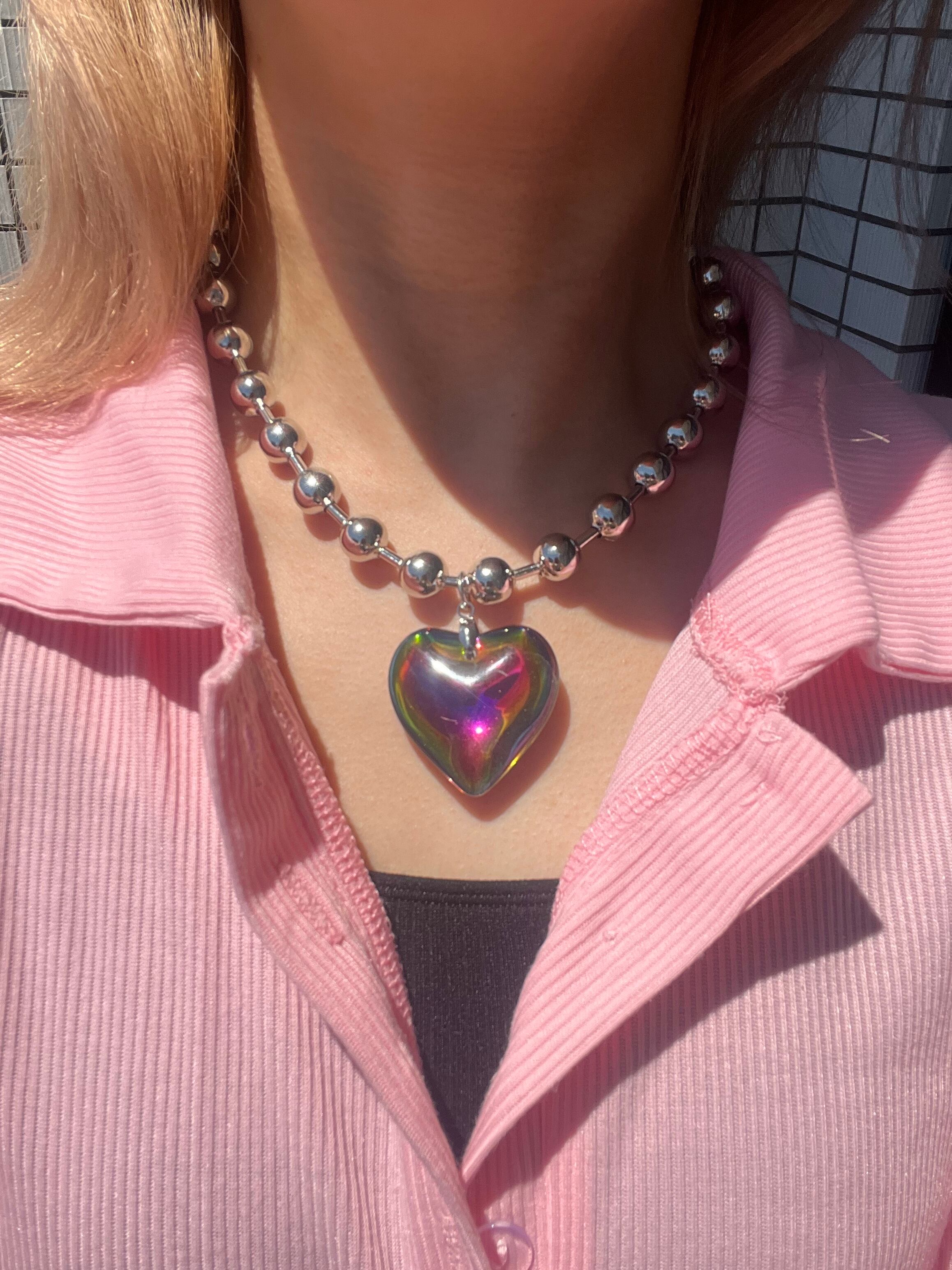 光の加減で色が変わる七色のチェーンネックレス。