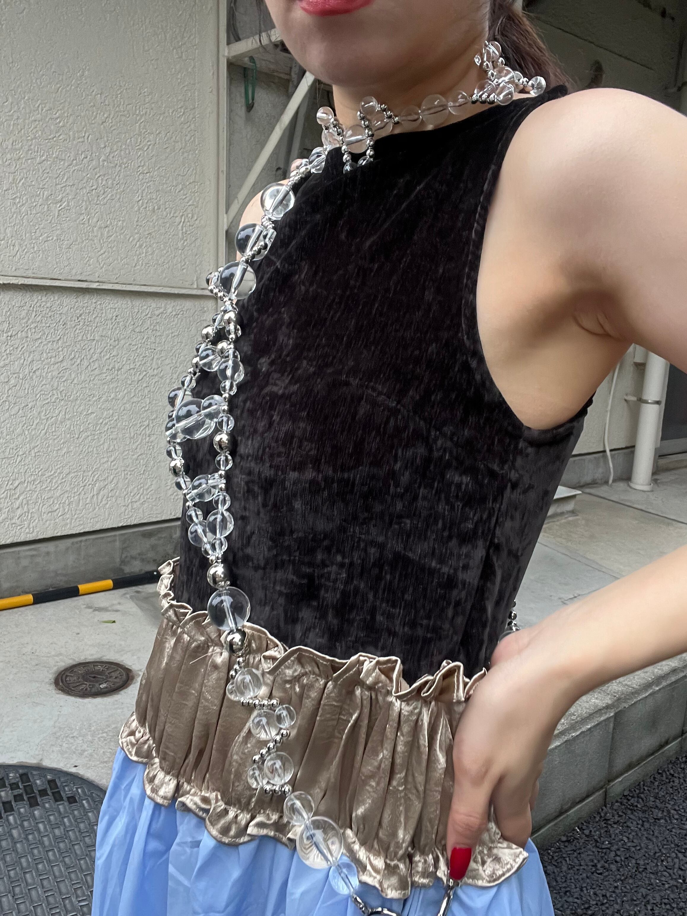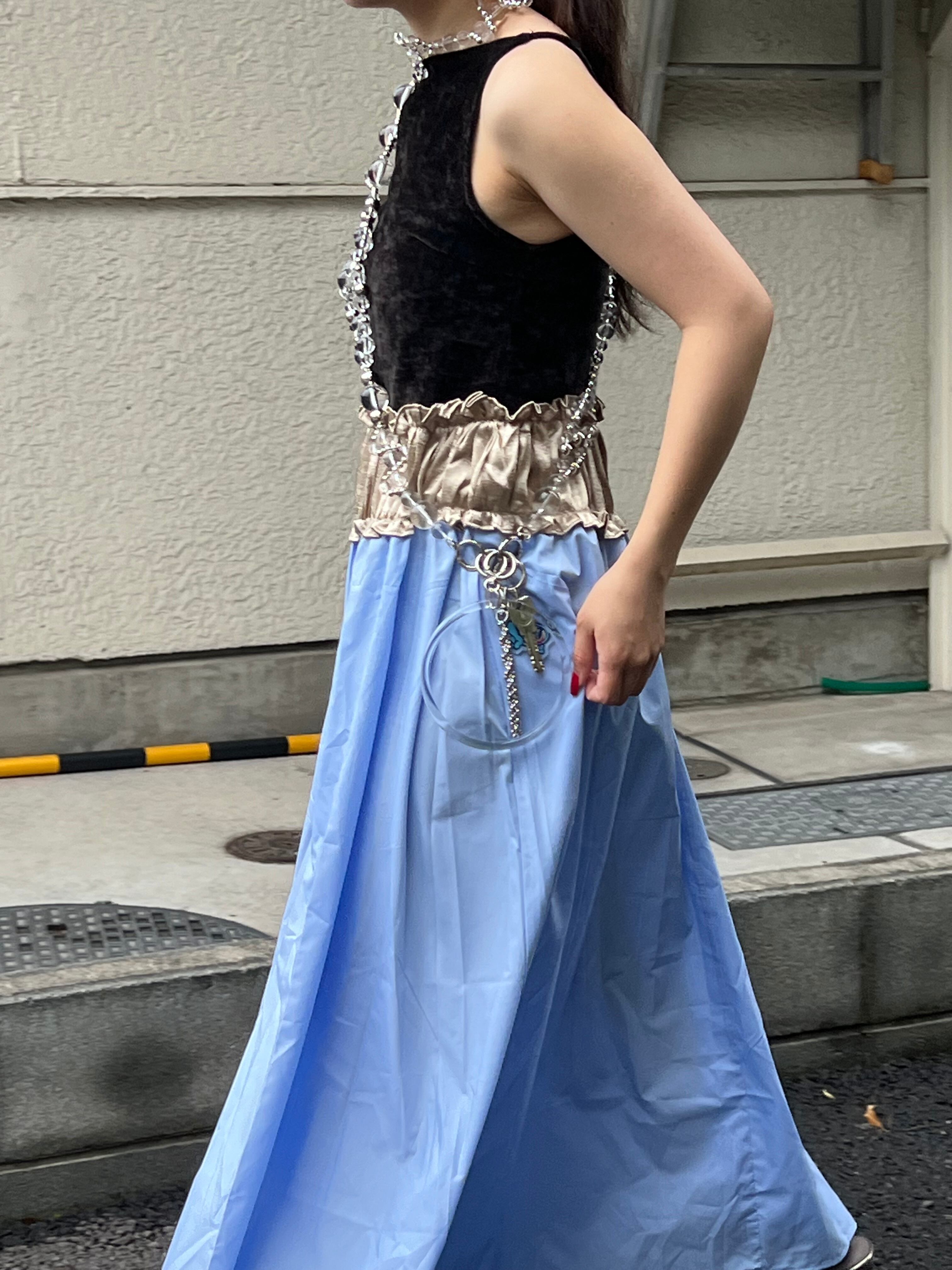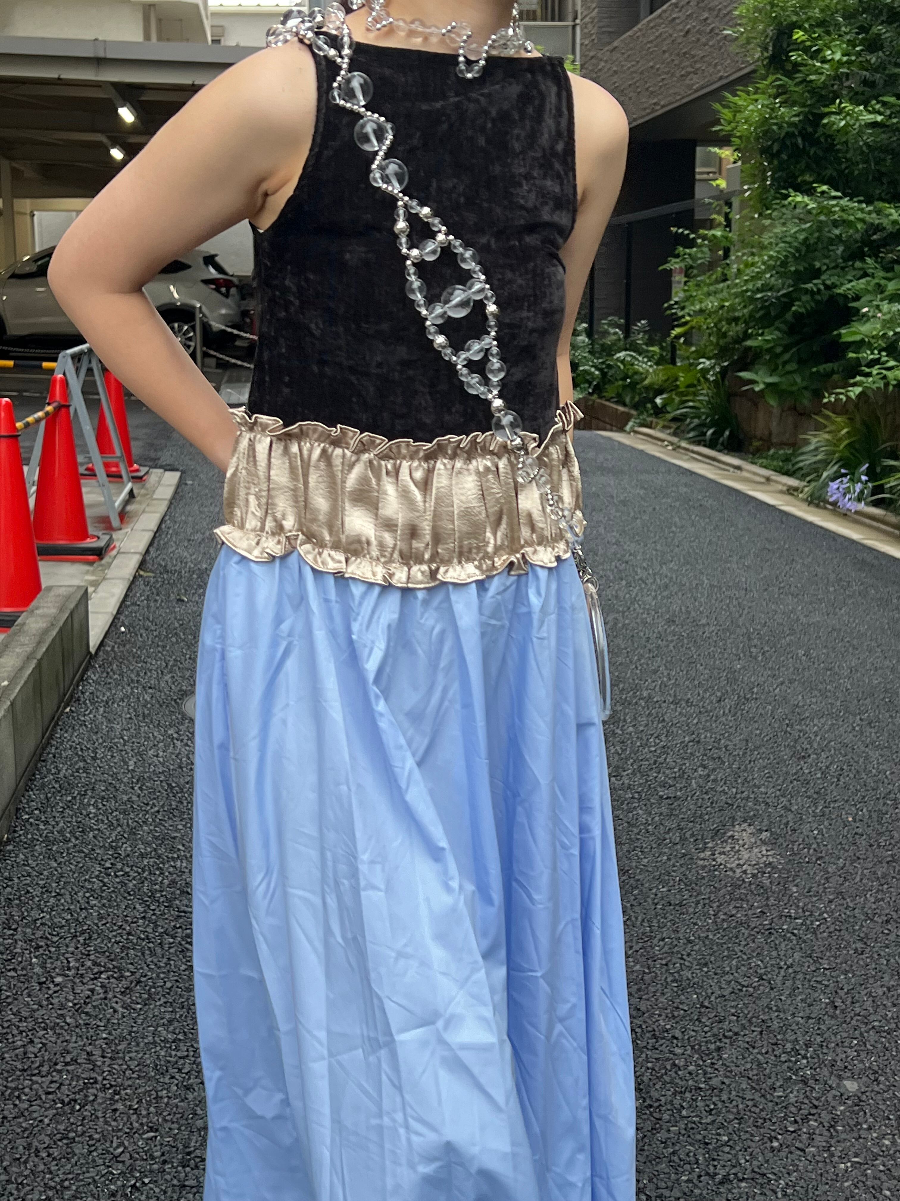 上からベロア、サテン、コットンと様々な素材を合わせたロングワンピース